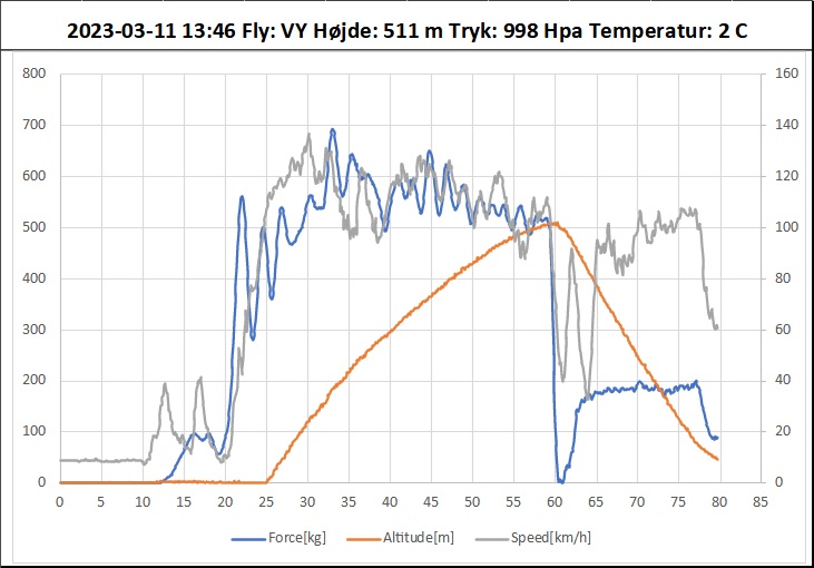 Venstre akse: Træk[kg] & Højde[m] Højre akse: Hastighed[km/h] Nederste akse: Tid[s].